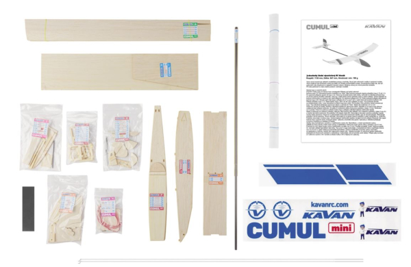 Die Konstruktion des Modells beinhaltet auch die Möglichkeit, eine RC-Miniatur-Anlage zu installieren – CUMUL mini kann dann wie ein reiner Segler mit steuerbarem Seiten- und Höhenleitwerk fliegen, oder Sie können ihn mit einem kleinen, im Bug oder auf dem Pylon über dem Flügel platzierten Brushless-Motor motorisieren.
